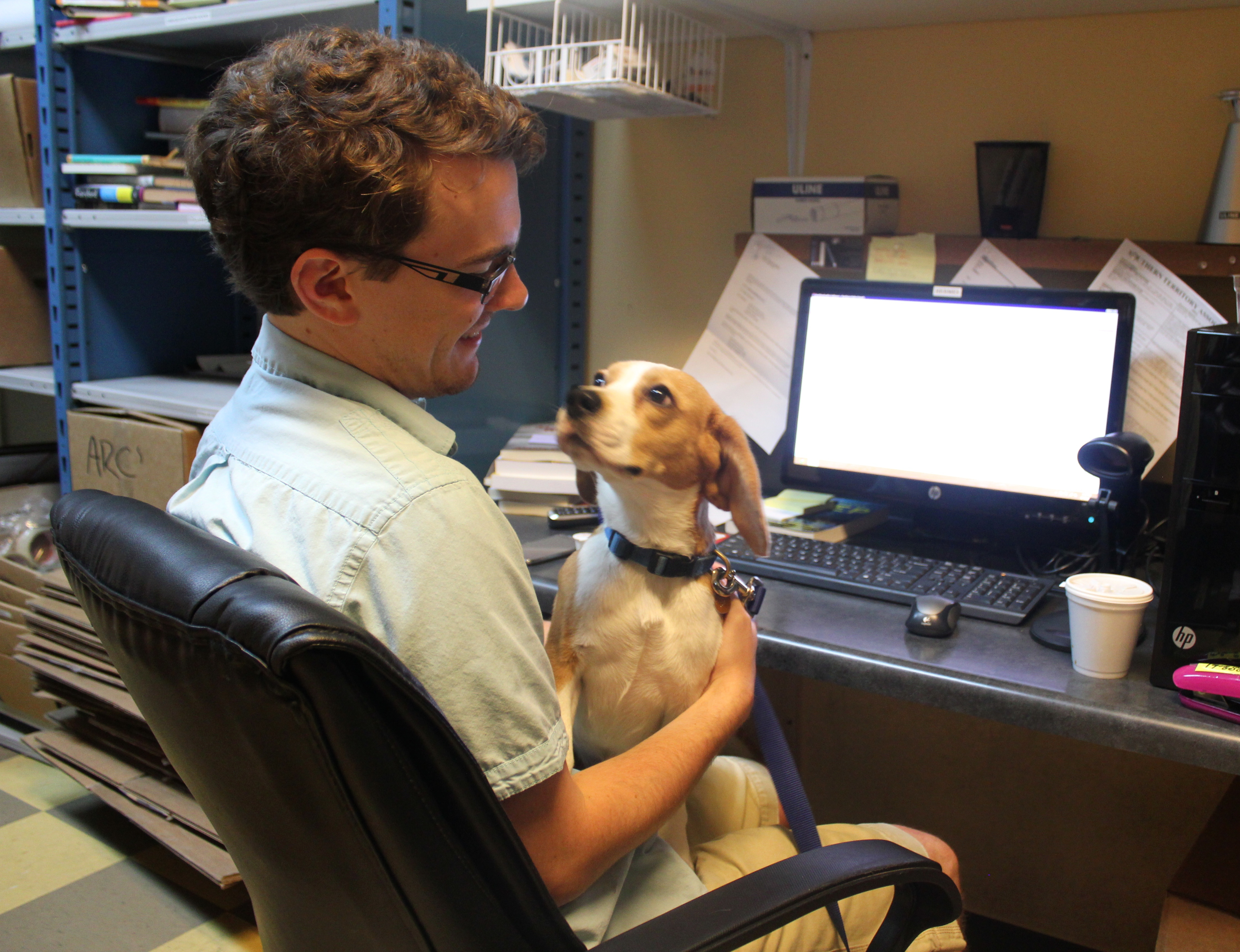 Next question: What do you do when you need to know what’s on order for the coming week? Answer: Go ask Tristan. (We let Eleanor Roosevelt sit there for a while and look at Tristan’s face, because she has a fondness for glasses. Honestly, it’s kind of weird. I’ve never known a dog so fascinated by eyewear.)