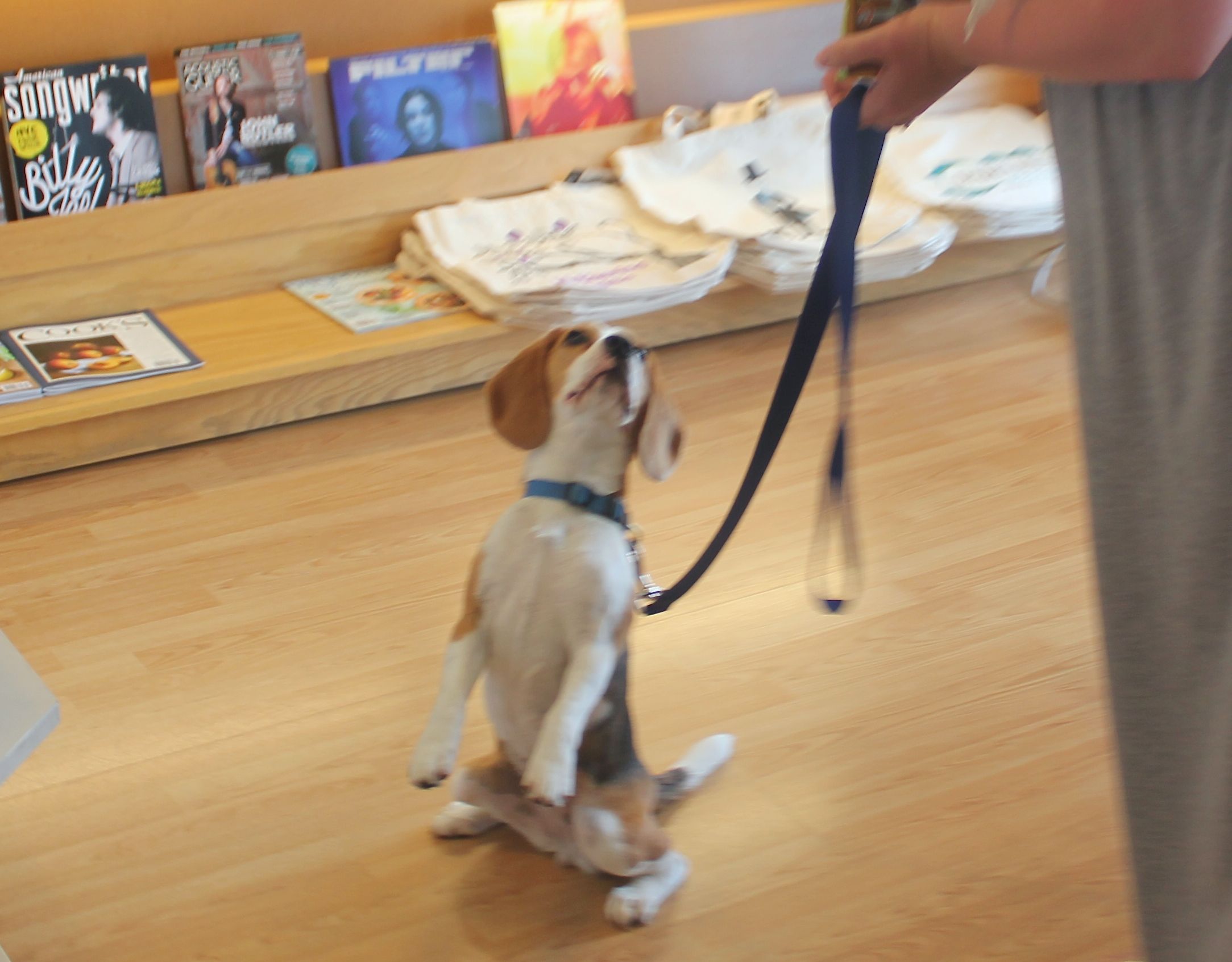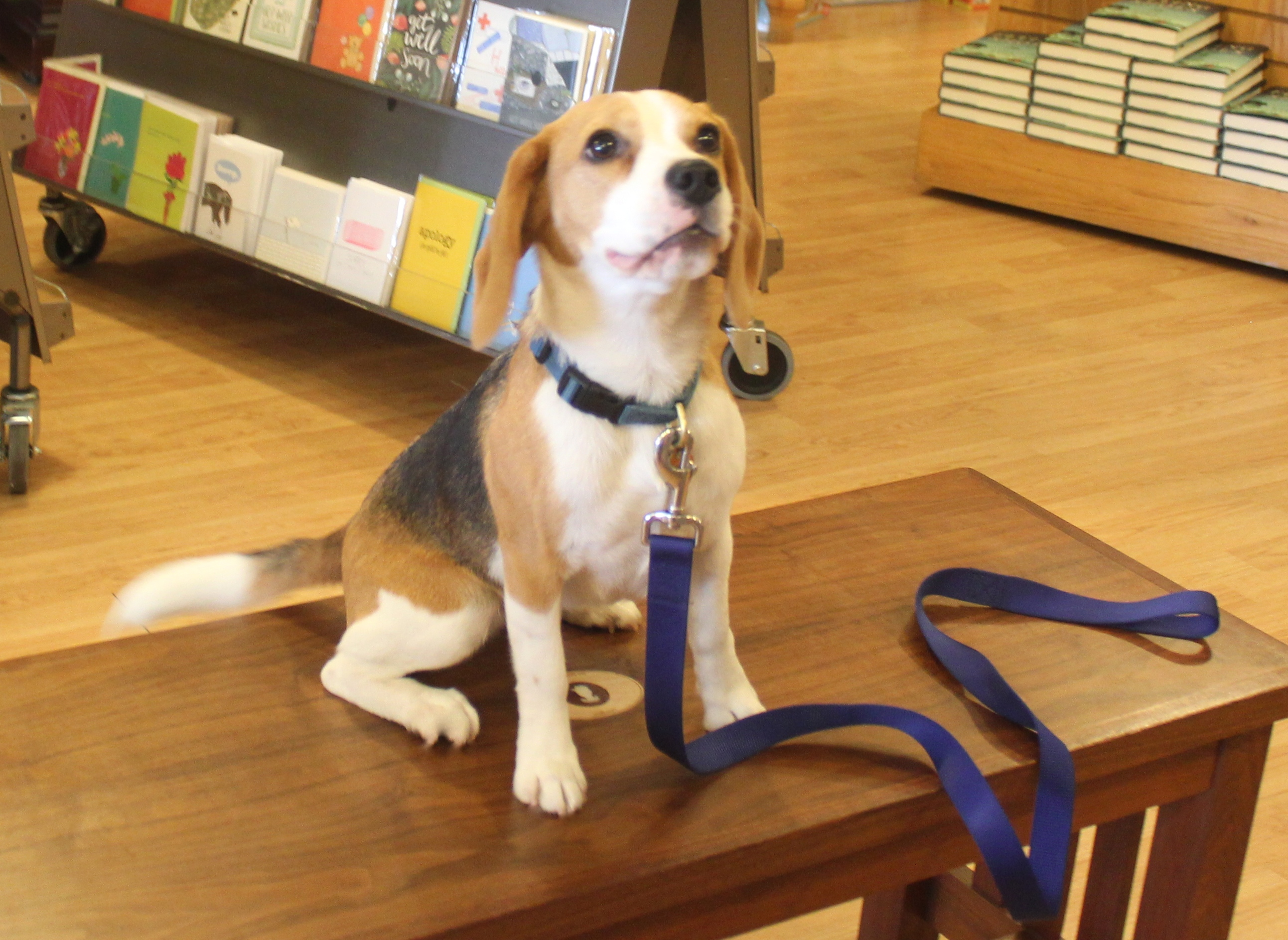 Hi. It’s me, Opie, the dog of the store manager. I’d like to introduce you to my friend, Eleanor Roosevelt. ^ That’s her. She used to be the “special correspondent” of our shop dog team, but now that she’s not a baby anymore, it’s finally time for her to start work at the store. That’s where I come in. As senior store-hound, it’s my job to teach the junior store-hound how everything works. Here’s how the first day went.