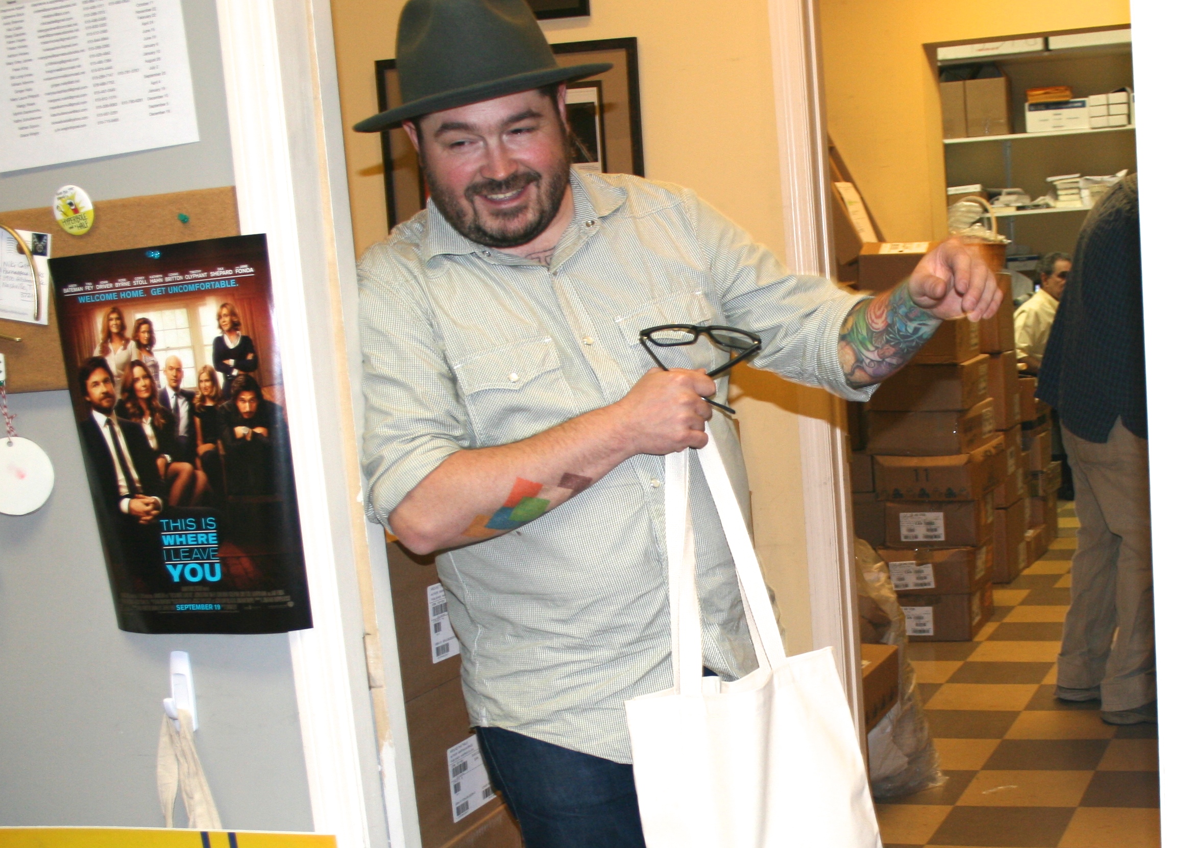 Well, obviously, we’d have a tattoo show-and-tell. Catherine and Niki checked out some of Brock’s ink.Then we did a side-by-side arm comparison, in which Brock’s colorful harvest made Mary Laura think she should maybe get at least a little beet or radish on her wrist.Next, Brock invited the shop dogs who were working that day — Opie and Bear — to gather ’round for storytime. He read them a recipe with lots of meat in it. They behaved poorly and jumped around like blind rabbits instead of paying attention.When we told the dogs they had to straighten up and listen to the story, Bear dropped to the ground and did this — which is… kind of like listening? (Obviously, Bear’s the kind of fan who becomes paralyzed with awe in the presence of certain authors.)Still had some time to burn, so Brock pulled out his bag of records he’d picked up at a vintage vinyl shop and showed Andy, Sissy, and Steph his latest finds.Here’s one by Johnny Cash called “Look at Them Beans.” For real. It’s actually called “Look at Them Beans.” You can’t make this stuff up.Talking about music led to talking about art, and we thought Brock might like to have one of our new tote bags to keep his records in. This one has a fabulous image from local artist Alex Pearson of Familytree Designs on it.At this point, those of us in the back office were no longer even pretending to get work done. It was just too much fun to listen to Brock’s stories. Here, he’s telling us about the time he first discovered Instagram and didn’t realize that anyone and everyone could see his photos, so he was taking pictures of his feet and testing out different filters until a friend called and said, “Dude, why are you posting pictures of your feet on Instagram?” (Hey, who hasn’t had a social media mishap, right?)It was getting close to lunchtime, so we pulled up the website for Brock’s latest opening, a casual, Mexican-inspired restaurant in Charleston called Minero. (Brock’s also the chef behind McCrady’s in Charleston.) His description of how he coats the outside of his burritos in cheese to make them crunchy made us hungry, and not for the leftover sandwiches we had in the office fridge. Sigh.