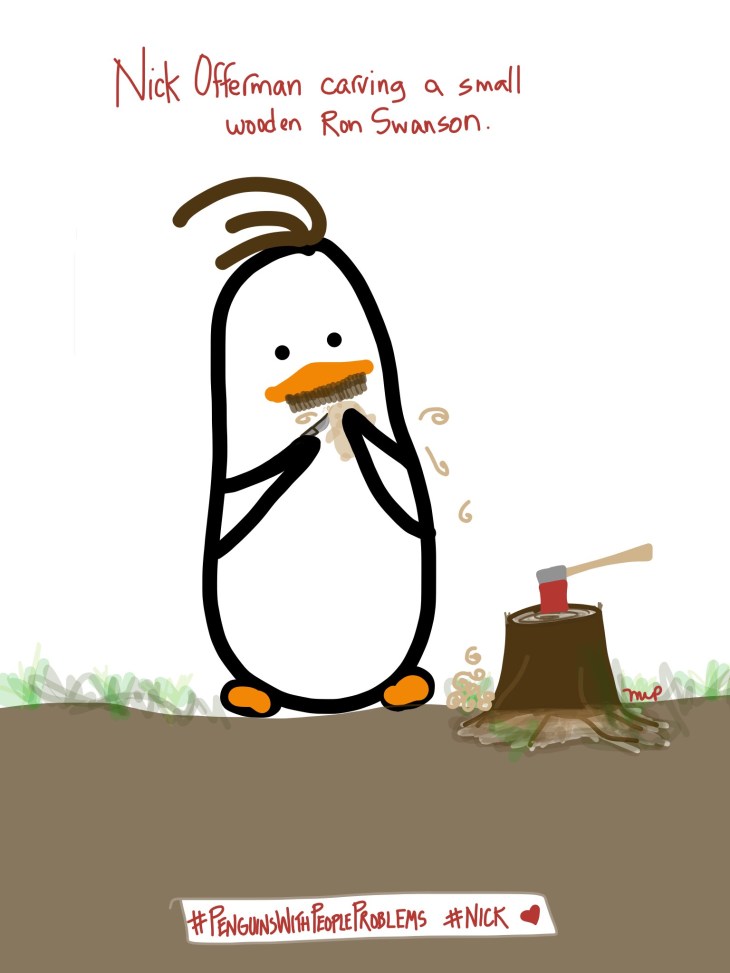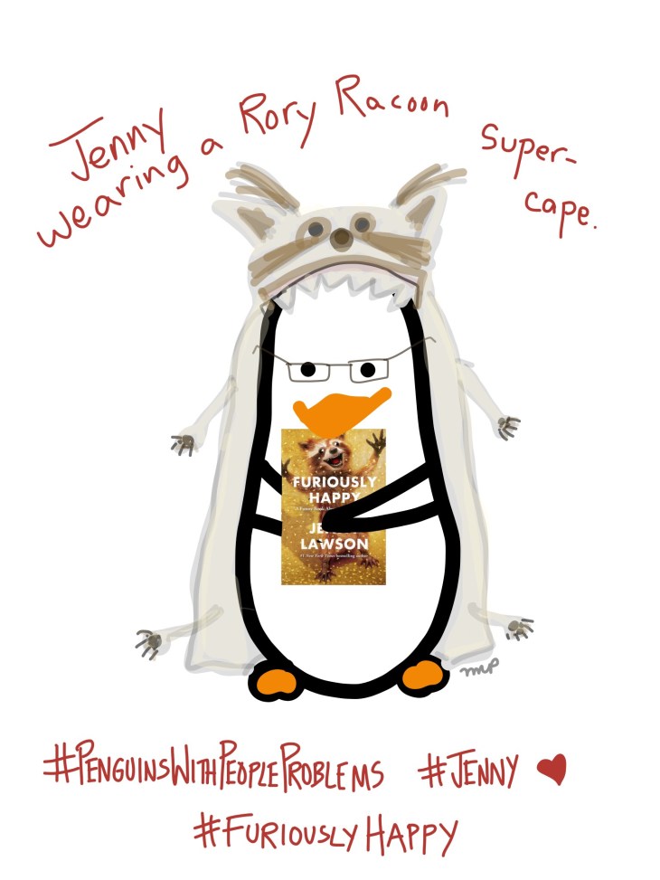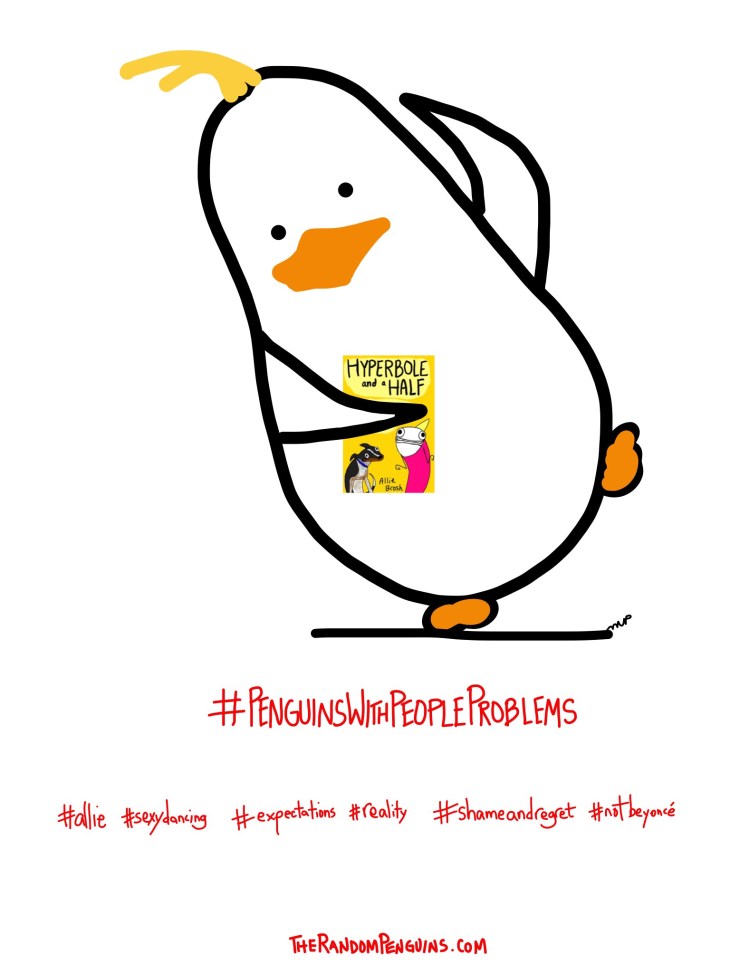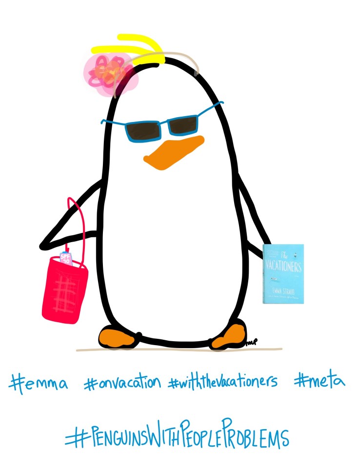 “Well, we have to start with Ann Patchett, right? This is Ann wearing a green woolen cape thing she has that always looks fabulous on her, and there’s Sparky. If you were to zoom in really tight, you’d see that his tag says ‘SPARKY VAN DEVENDER.'”“I did one of Karen, too. She’s an amazing photographer, but I always tease her about the crazy filters and effects she puts on her photos and videos.”“This is the one and only Emma Straub, taking her book The Vacationers on vacation. She’s such a ray of sunshine and so smart. She’s also the one who introduced me to Almost Famous Women author Megan Mayhew Bergman, which — actually, Megan, if you’re reading this, I owe you a Megan-penguin.”“Our interview with David Sedaris is still the most widely-shared piece we’ve ever done on Musing. It was a real thrill to present him with his penguin when I met with him earlier this year. This is a depiction of David picking up trash and wearing his FitBit in his neighborhood in England.”“This probably looks really weird unless you know the book it’s referencing. I made this for Claire Cameron, who wrote the fabulous novel The Bear — which I was afraid to read and then loved. In the story, two little kids climb into a Coleman cooler to hide when a bear attacks their family campsite. This is a penguin version of that scenario.”“We all wanted to high-five Roxane Gay after she wrote the brilliant/hilarious Bad Feminist, so I had to make this. Hopefully, we’ll get her to Nashville sometime so we can high-five her in person.”“You know when you talk to someone you’ve never met, but you just get their sense of humor so much and they’re so smart and you wish you could hang out for another hour? That’s how I felt talking to Megan Amram on the phone. She’s a comedic genius.”“Sticking with the ‘comedic genius’ theme… There is no one — absolutely nobody — on earth like Allie Brosh. I’ve never laughed as hard at anything as I have at some of her Hyperbole and a Halfpieces. This is a reference to one she wrote about how in her mind she can dance like Beyoncé but in reality, not so much.”“More comedy: This is Mallory Ortberg, co-editor of The Toastand author of Texts from Jane Eyre. If you don’t have this book, please get a copy. And then go read every single thing she has written on The Toast. You’re welcome.”“Most people know Elizabeth McCracken as a writer of gorgeous fiction and spectacular narrative nonfiction, but you also need to know she’s hilarious on Twitter. I would read a whole book of her tweets if there were one.”“True story: I made this picture of Jenny Lawson (aka The Bloggess) wearing a big taxidermied animal cape of some sort — kind of a cross between a bear and a raccoon and a giant squirrel — and the VERY NEXT DAY she unveiled the cover of her next book, Furiously Happy. Look at that animal! So of course before I sent her the image, I amended it to show her holding her book.”“This is Lily King, author of Euphoria. Lily sat next to me on a panel at the Southern Festival of Books last year. At one point, she pulled her writing notebook out of her bag and showed everyone how she plots her fiction in teeny-tiny writing on this enormous fold-out page. It was a riot. And she’s coming to the store on June 17! I am insanely grateful to Lily for writing a little blurb for the penguin book and calling it ‘thoroughly random and absolutely hilarious.’ That was so sweet.”“Here’s Glennon! I just love Glennon Melton. She wrote Carry On, Warrior, which I like to give out to people whenever they’re going through a hard time. She tells a hilarious story about being at a mall food court with her kids and watching some other mom feeding her baby a super-healthy lunch. Glennon said it made her feel inadequate, like the other mom was feeding her baby avocado AT Glennon. I totally get that.”“This is Matthew Quick. I feel like I really nailed his glasses here, right? His books — and his writing, and his mind, for that matter — are unlike anyone else’s. I was excited to choose his next one, Love May Fail, as a summer pick for our First Editions Club. I’m so happy he’s coming back to Nashville on June 19.”“Jill Alexander Essbaum recently visited to sign Hausfrau, and we all had a blast with her. She told us about the symbolism and easter eggs hidden in the cover image.”“One of the blurbs for the book is from Ann Imig, editor of the Listen to Your Mother collection, who said Penguins with People Problems is ‘like Sandra Boynton for grownups.’ That’s an enormously kind thing to say, first of all, but also a touching comparison. We love Boyton books at Parnassus, and I read them to my kids when they were babies. So I drew one of my penguins talking to one of Boynton’s penguins and asking to be friends.”“This is for the hilarious Nick Offerman (aka Ron Swanson from Parks & Recreation), in honor of his new book, Gumption.”“Every time I start to feel like I’m really busy, I think, well, I’m not nearly as busy as Mindy Kaling. She’s such a powerhouse, and she works so hard. This is her with her last book, Is Everyone Hanging Out Without Me? She has another one coming soon called Why Not Me? I love how outspoken she is. Mindy should be queen of America.”“This is Matt Damon. Why? Because. Actually, although this image isn’t in the book, it’s referencing something about the book. You’ll have to read it to find out.”