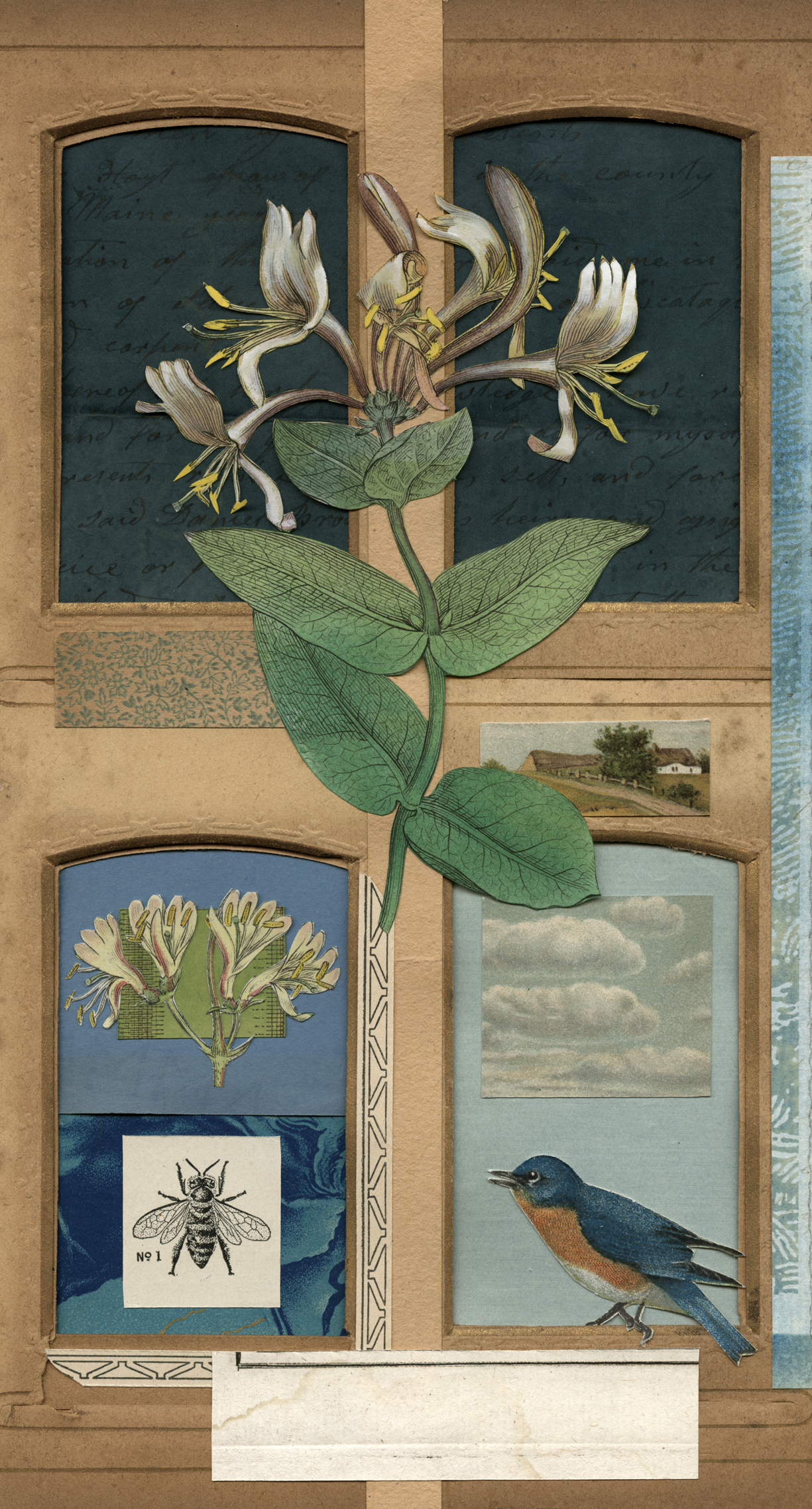 MR: I love the way you used antique photo mounts to provide the borders for the nature collages. They mimic images from an old family photo album, which is a really subtle visual way to convey the human kinship with the natural world. That kinship is one of the most formative experiences of my childhood. Some of my favorite memories are set in the woods around whatever apartment we were living in at the time, or all over Mimi and Granddaddy’s farmland. Is there a story you particularly remember from all the time we spent in the woods as kids?