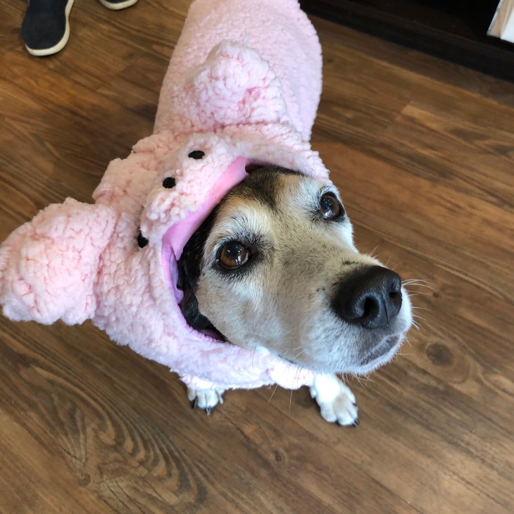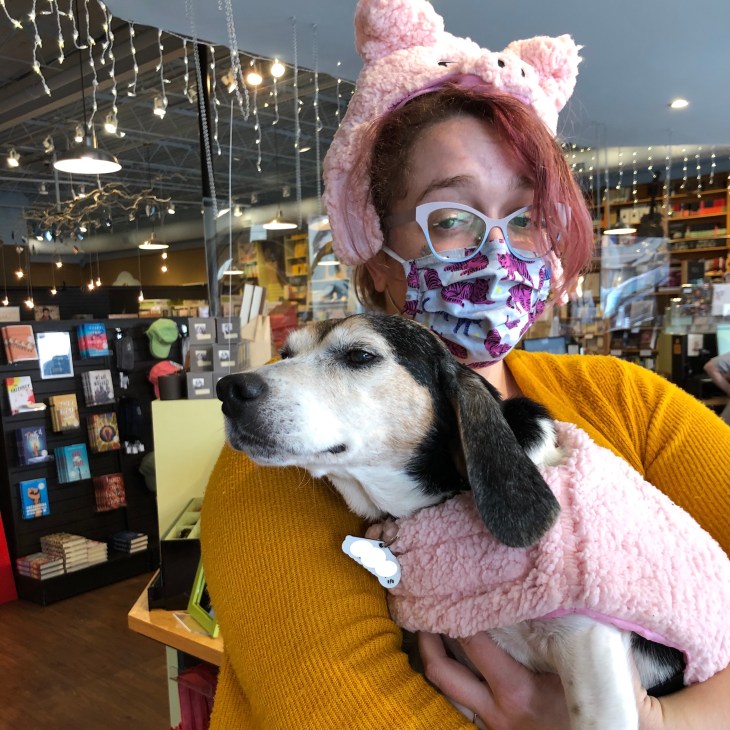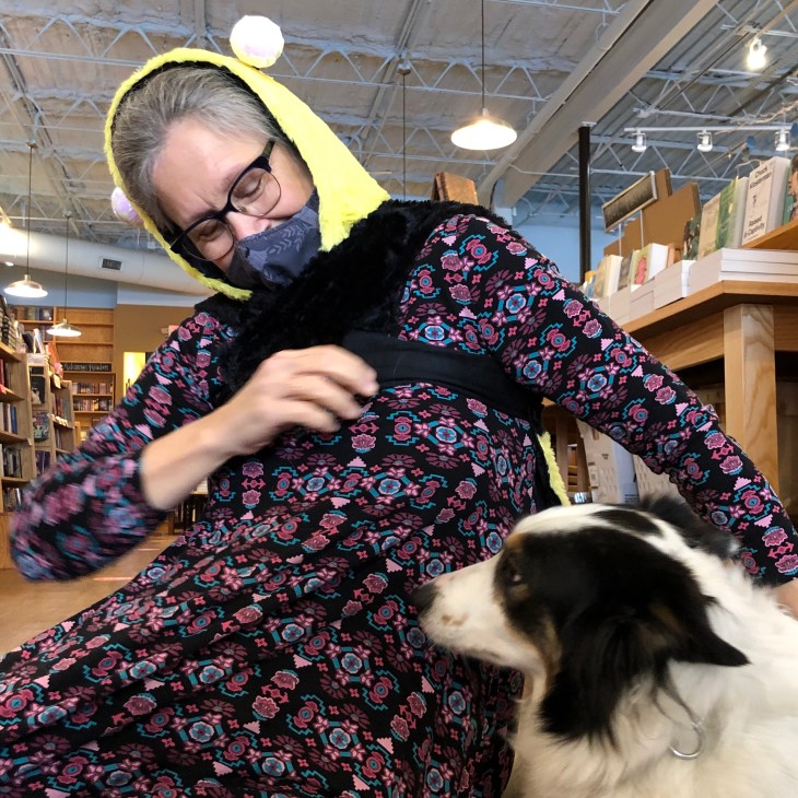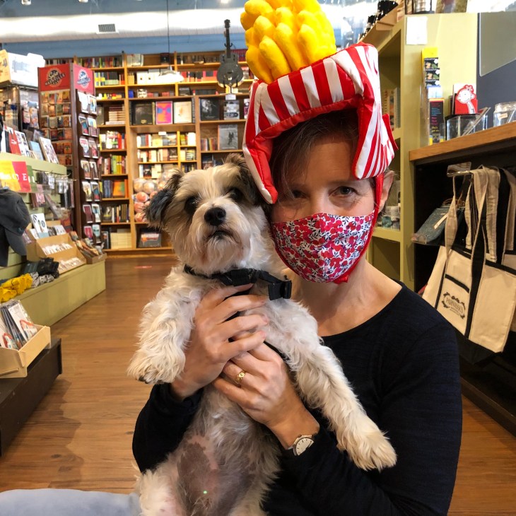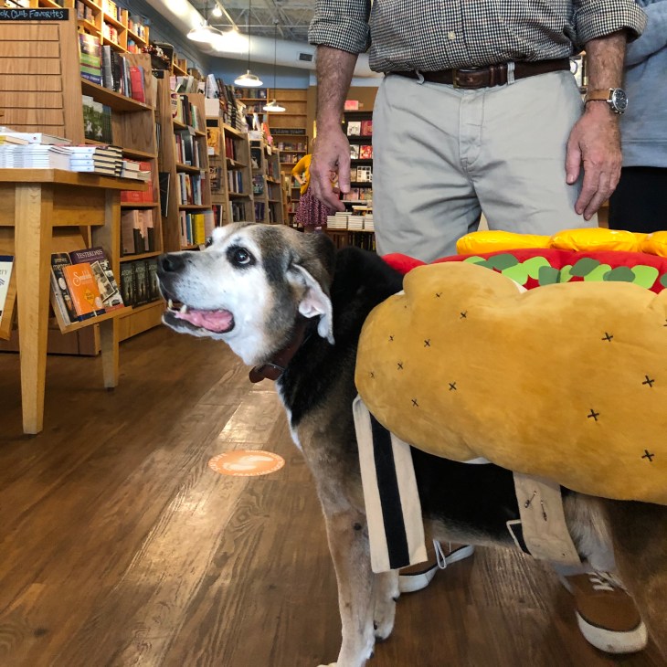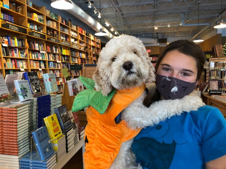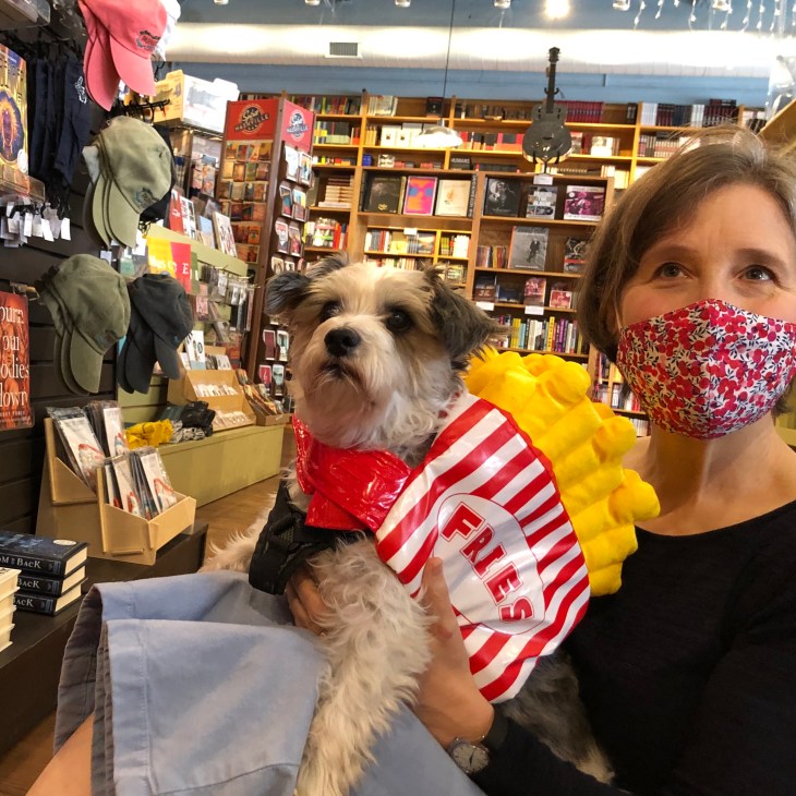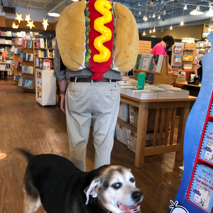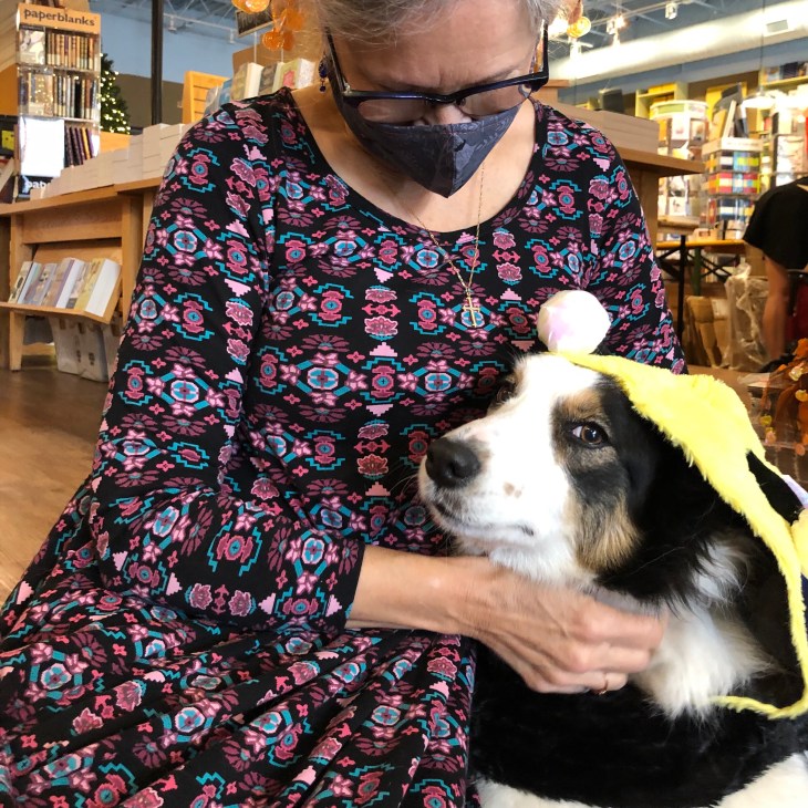 When we were puppies and wanted a treat, we simply went up to a human and asked for one. We did this by looking cute. We didn’t need a costume for that because we looked cute every single day of our lives. You humans gave us treats not only because of how we looked but because we were good and loyal and kind. And because we were all these good things, you continued to give us treats every day of the year, sometimes many times a day, sometimes many times an hour on the days that Pete was working in the back of the bookstore, what the Shop Dogs call “Our Happy Place.”