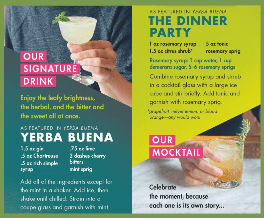 SA: Back to Yerba Buena: Mixology plays a fun role in the book, and you even created a signature drink to go with it! What was that process like? Do you have a background in bartending?
