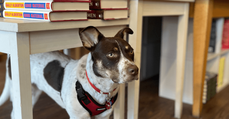 KIMBERLY BRUBAKER BRADLEY: Hello, Auggie! So nice to meet you. I’ve always loved the Parnassus shop dogs and I’m delighted you’ve joined them. (I miss Bear. If you’re stepping into his place, you’re filling big shoes.) My dogs Cava (a cavoodle) and Beverly Cleary (a schnoodle) send their love. They’re not bookstore dogs, but they’re excellent writer dogs, always keeping me company while I work. (Bev sometimes insists on helping type. She’s not very good at it.)