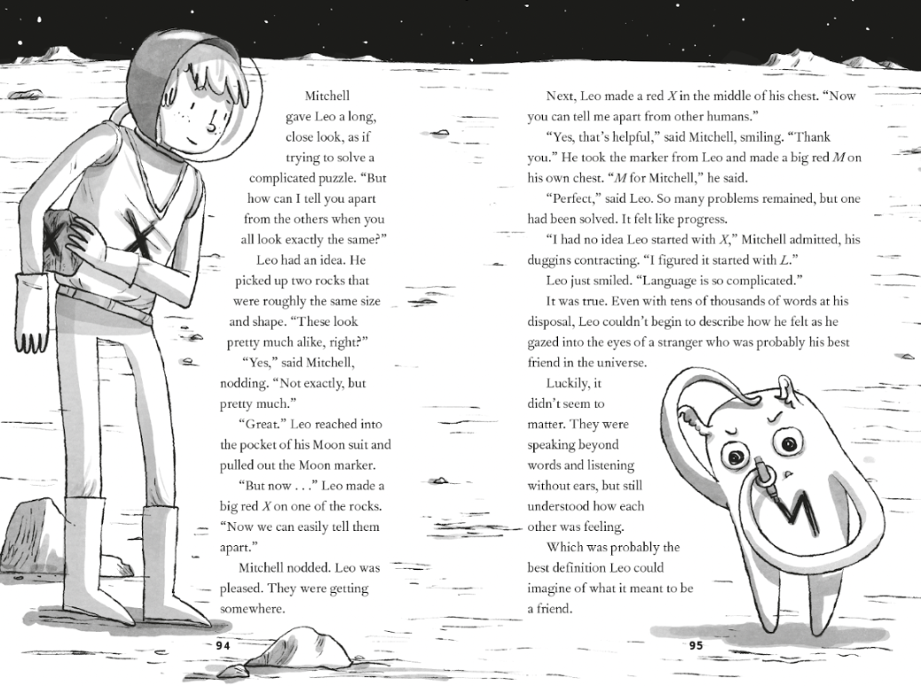 M: I mean, I should be honest. Leo is in many ways me, just as any character that I write is in many ways me. And in this particular book, Leo is the part of me that is wrestling with his parents’ divorce, wrestling with a lot of confusion and insecurity that comes from feeling profoundly displaced. He goes to the moon hoping to find a fresh start and a chance to figure out who he is. But he’s immediately cast into a place of uncertainty and discovery. And the thing that I love most about Leo…